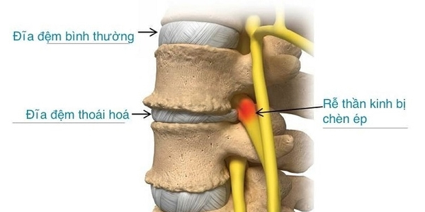 Thoái hóa cột sống khiến xương chèn ép lên các dây thần kinh. Từ đó dẫn đến các cơn đau tê buốt từ thắt lưng xuống hai chân, những nơi mà dây thần kinh tọa đi qua.